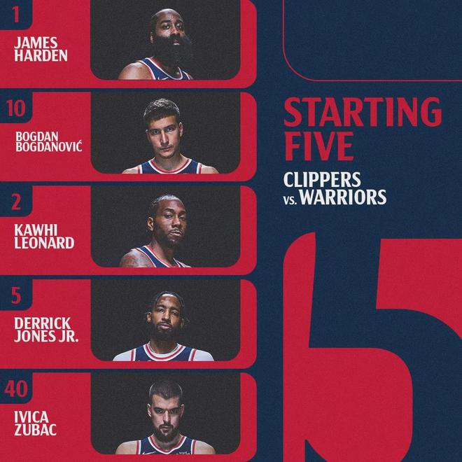 勇士首發:庫里、巴特勒、庫明加、追夢、波斯特。快船首發:哈登、博格丹、倫納德、小德里克-瓊斯、祖巴茨。祖巴茨本賽季場均16分6.7籃板3.3助攻1蓋帽2失誤,投籃命中率65.6%。得分比上賽季少了0.8分,籃板少了5.9個。