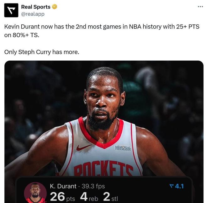 憑借這樣的表現,杜蘭特生涯已經第67次砍下25+且真實命中率80+%,追平哈登并列歷史第二,僅次于庫里的100次。