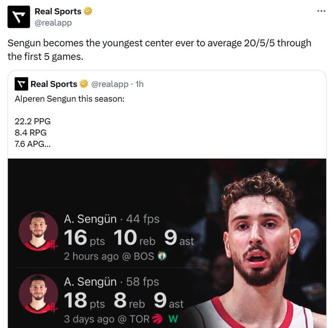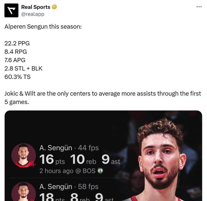 同時申京開季前5場場均送出7.6次助攻,僅次于約基奇與張伯倫高居NBA歷史第三,交出了火箭隊期待中的組織與策應表現。